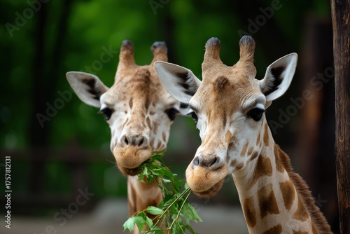 Naklejka premium Two giraffes are chewing fresh green leaves, showing their herbivore nature...