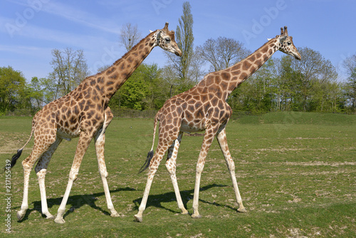 © Christian Musat, Naklejka premium Two giraffes (Giraffa camelopardalis) walking on grass in single file