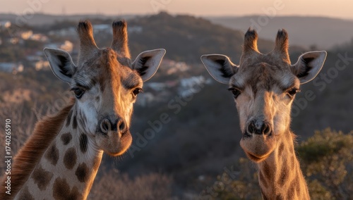 © rohmat, Fototapeta premium Two giraffes, illuminated by golden light, in front of a blurry landscape