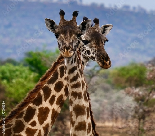 © Aniek, Naklejka premium Two giraffes necks crossed with each other, close up