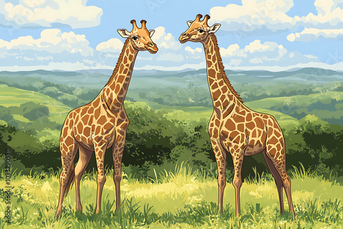Obraz premium Two giraffes standing in a lush green landscape under a blue sky with fluffy...