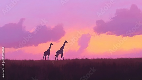 © adha, Fototapeta premium Two Giraffes Walking Across a Field at Sunset with a Pink and Orange Sky Landscape