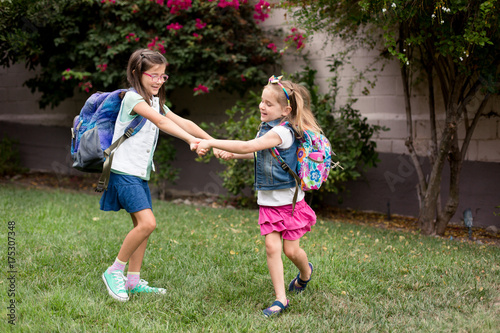 © falonkoontz, Naklejka premium Two girls are playing excitedly and anxiously before their first day of school.