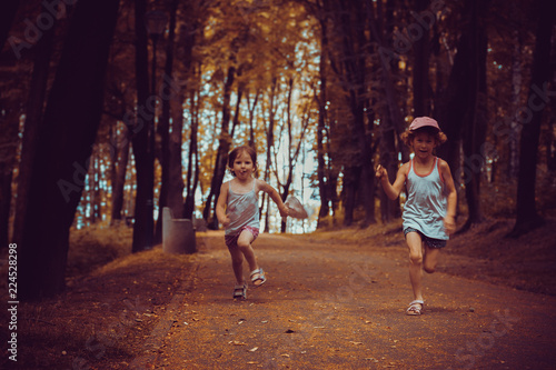 © Rajtar photography, Fototapeta premium Two girls are running around the park, who is first