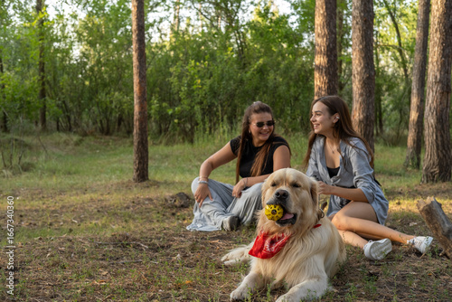 © leroy, Obraz premium Two girls are walking with retriever dog in the pine forest.
