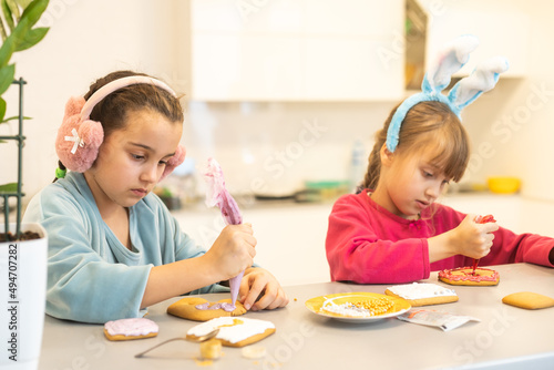 Fototapeta premium Two girls decorate cookies on plates with chocolate icing. Cooking treats for...