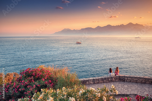 © EdNurg, Obraz premium Two girls friends are sitting resting and watching a beautiful bright sunset from an observation deck in the park. Wonderful mountains in the sunlight and ripples on the Mediterranean sea