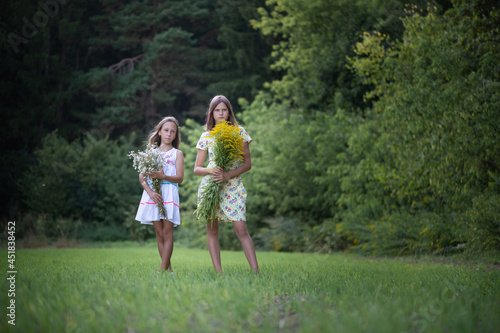 © shymar27, Obraz premium Two girls friends with bouquets of flowers are posing in the forest.