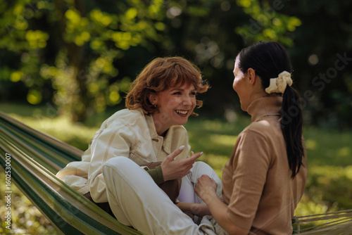 © bernardbodo, Fototapeta premium Two girls having fun in the park, sitting in a hammock