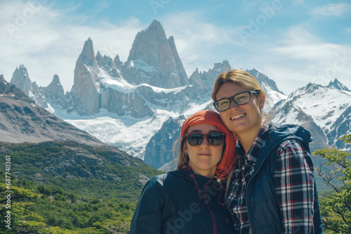 Naklejka premium two girls posing, fitroy mountain in the back
