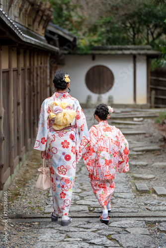© Shawn.ccf, Fototapeta premium Two girls wearing Japanese traditional Kimono walking on the street. Kyoto, Japan.