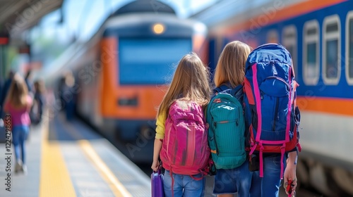 © VictorCanalesStudio, Obraz premium Two girls with backpacks are waiting for their train at a railway station, ready for a summer adventure