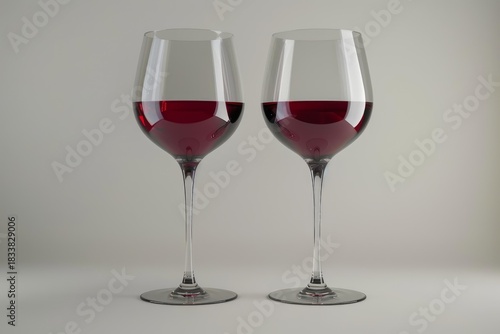 Obraz premium Two glasses filled with red wine stand on a minimalist background, creating...