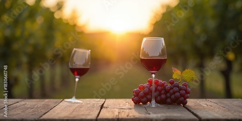 Naklejka premium Two glasses of red wine and a bunch of ripe grapes on a table in a vineyard at sunset, highlighting harvest season and wine production,