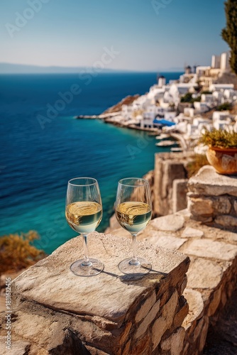 © Anna, Obraz premium Two glasses of white wine on a stone wall overlooking a turquoise bay and Greek town