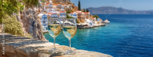 © Anna, Obraz premium Two glasses of white wine on a stone wall overlooking a turquoise bay and Greek town