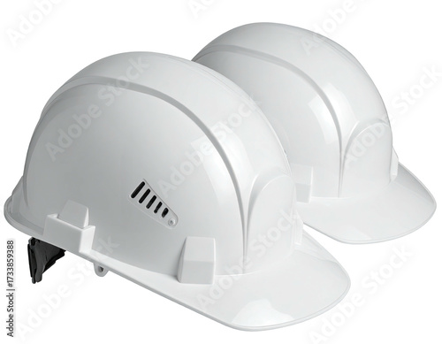 Fototapeta premium Two glossy white protective helmets, side by side, on a transparent background