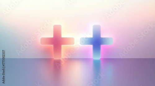 © btiger, Obraz premium two glowing crosses standing side by side with soft pink, orange, and blue light reflections on a smooth surface and a gradient pastel background creating a serene atmosphere
