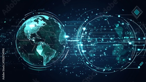 Obraz premium Two glowing digital globes interconnected, symbolizing global connectivity,...