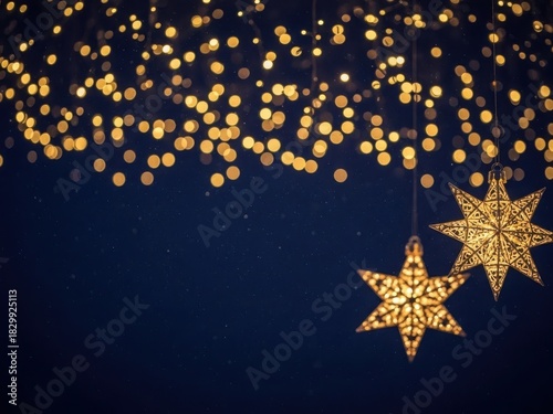 Fototapeta premium Two glowing, intricate starshaped christmas ornaments hang against a dark blue background illuminated by a cascade of warm, golden bokeh lights