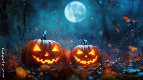 Fototapeta premium Two Glowing Jack-o'-Lanterns in a Mystical Forest Under a Full Moon