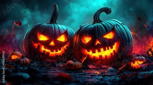 Fototapeta premium Two glowing pumpkins surrounded by smaller pumpkins
