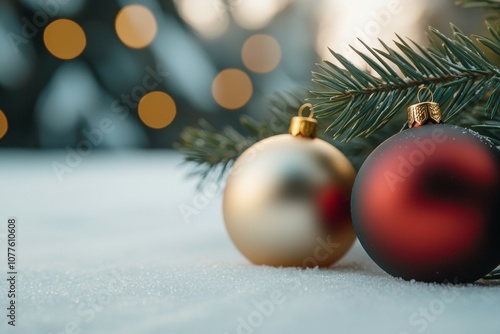 Fototapeta premium Two gold and red Christmas ornaments on a snowy background
