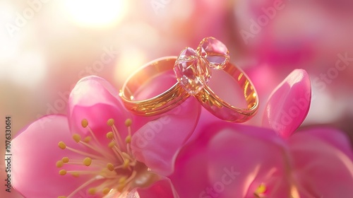© leymart, Fototapeta premium Two gold wedding bands with a diamond ring on top, resting on a pink flower blossom with a blurred background.