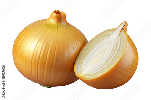 Obraz premium Two golden brown onions one whole and one halved showing the white interior isolated on transparent background