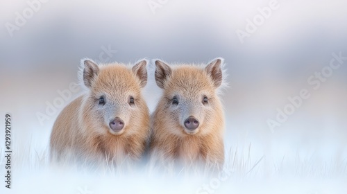 © KIMEHIME, Fototapeta premium Two Golden Piglets in Snowy Field