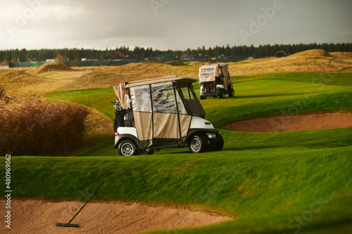 © Ruslan, Fototapeta premium Two golf carts for golf on the course
