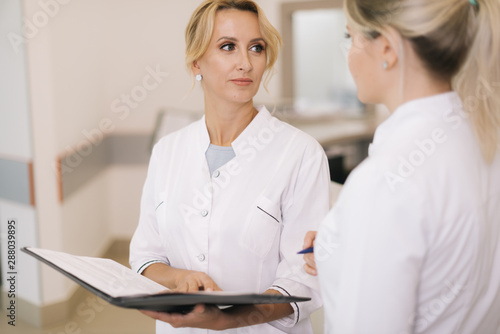 © dikushin, Fototapeta premium Two good-looking young female doctor looking at clipboard and working on patient record while standing in the corridor next
