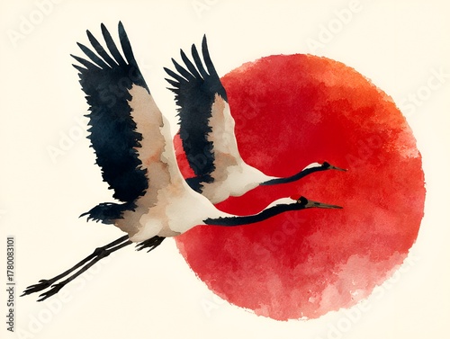 © CHAIYAPHON, Naklejka premium Two graceful cranes fly in front of a large vibrant red sun painted in a watercolor style design art.