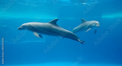 © Jagone Mas Zan, Fototapeta premium Two graceful dolphins swimming in clear blue underwater aquatic environment