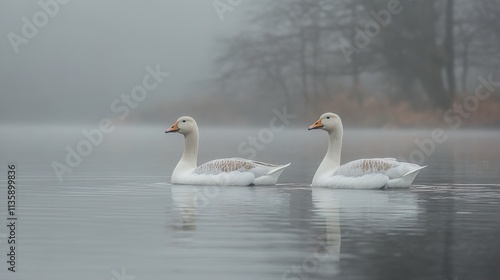 Fototapeta premium Two Graceful Geese in Misty Lake: A Serene Winter Scene