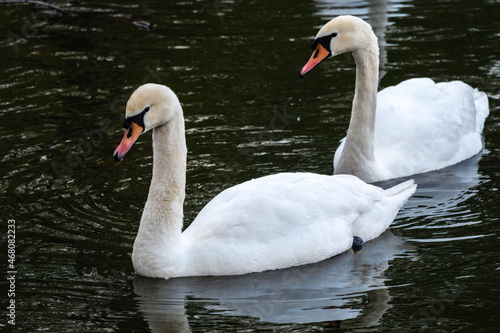 Fototapeta premium Two graceful white swans swim in the dark water.