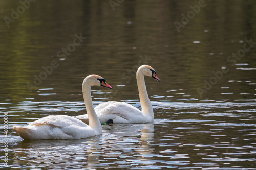 © Dmitrii Potashkin, Obraz premium Two graceful white swans swim in the dark water.