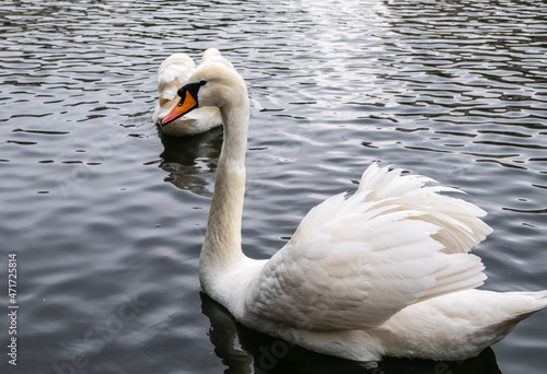 Naklejka premium Two graceful white swans swim in the dark water.