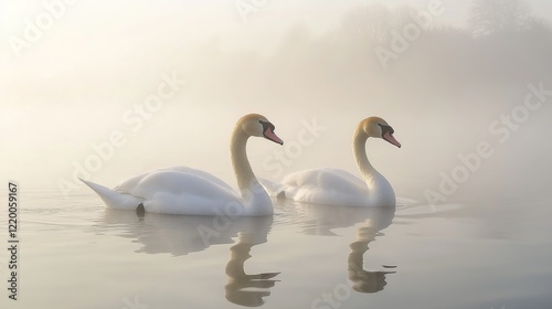 © Windi, Fototapeta premium Two graceful white swans swim on a misty lake at dawn, their reflections visible in the calm water.