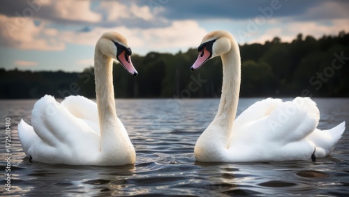 Fototapeta premium Two graceful white swans, with feathers like snow, swim in calm lake water...