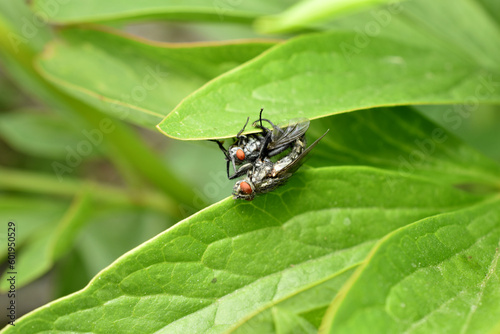 © Михаил Жигалин, Naklejka premium Two gray flies sit on a leaf of a plant.