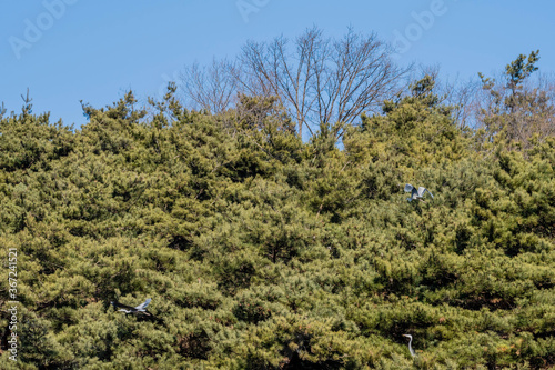 © aminkorea, Obraz premium Two gray heron flying, third perched
