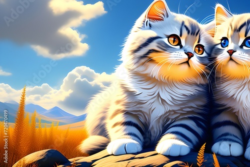 © ChaengU, Obraz premium two gray scottish fold cats loving each other in a hill under the blue sky. Generative AI