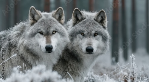 © Generative AI, Fototapeta premium Two Gray Wolves Staring Intently in Snowy Forest, Symbolizing Loyalty and Wildlife Conservation Efforts : Generative AI