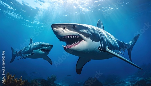 © Jasun, Fototapeta premium Two great white sharks in ocean depths