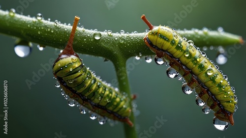 © azi, Naklejka premium Two green caterpillars with black stripes, clinging to a wet green stem with raindrops.
