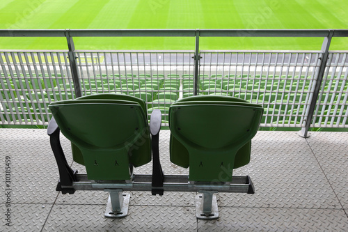 © Pavel Losevsky, Fototapeta premium Two green plastic seats on tribune of large stadium