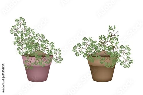 Obraz premium Two Green Trees and Plants in Ceramic Flower Pots