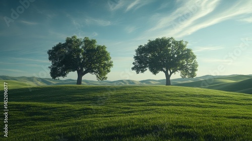 © pathiphan, Fototapeta premium Two Green Trees on Rolling Green Hills Under a Partly Cloudy Sky