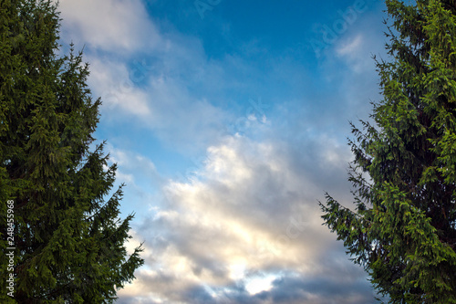 © Alexey, Fototapeta premium two green trees spruce against a cloudy sky
